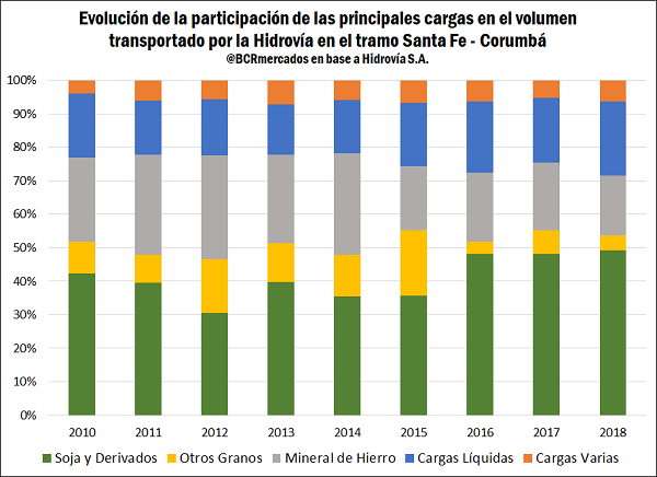 3) El complejo oleaginoso gana participación en el transporte de cargas por la Hidrovía a costa del mineral de hierro y los cereales.