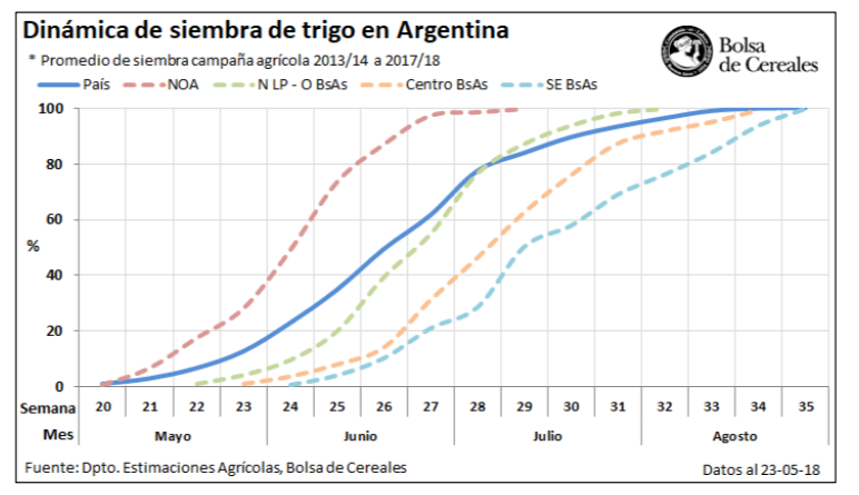 Durante las últimas semanas se comenzaron a relevar las primeras implantaciones con trigo para la campaña 2018/19. A la fecha, el progreso nacional de siembra alcanzó el 3,6 % de las 6.100.000 hectáreas proyectadas para la campaña en curso. Los mayores progresos semanales se concentraron sobre las regiones del NOA, Centro-Norte de Córdoba y Centro-Norte de Santa Fe.