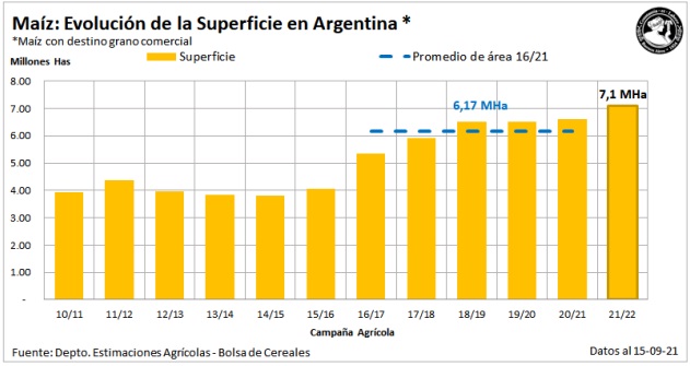 Durante los últimos días comenzamos a relevar la siembra de maíz con destino grano comercial de la campaña 2021/22 en el centro del área agrícola nacional. La mejora en las reservas hídricas de los perfiles permitió que se incorporen los primeros lotes de planteos tempranos del cereal. El avance de siembra cubrió, el 2,3 % de las 7.100.000 hectáreas proyectadas para el nuevo ciclo. Esta superficie representa en números absolutos 500.000 Ha más que las implantadas en la campaña previa (Campaña 2020/21: 6,6 MHa). Al momento de la presente publicación, las labores muestran una demora interanual de 4 puntos porcentuales