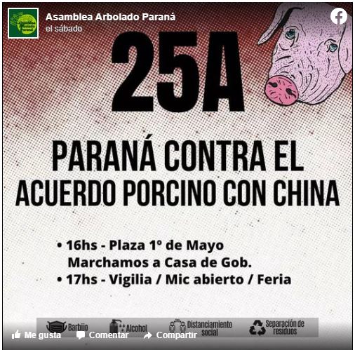 Distintas agrupaciones ambientales políticas y sociales están convocando a través de las redes sociales a una movilización en protesta por el acuerdo con China, que proyecta la instalación de granjas de producción porcina. Esta acción se desarrollará en distintos puntos del país el miércoles 25 de agosto.