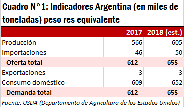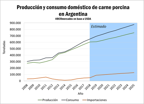 En 2017, la producción argentina de carne de cerdo en toneladas res equivalente fue de 566.276, un 8% superior a la producción del año anterior. El USDA estima una producción de 605.000 toneladas para el corriente año y proyecta un crecimiento del 32% para el año 2025, cuando la producción alcanzaría las 748.800 toneladas. El consumo, por otra parte, también aumentaría según cálculos del USDA pasando de 609.000 toneladas en 2017 a 652.000 toneladas en 2018.