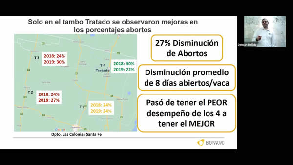 Con respecto a los resultados de tambo, se presentaron cuatro casos de tambos de tres provincias distintas (Santa Fe, Entre Ríos y Córdoba). El tambo de Santa Fe, que fue el que se analizó en más detalle, era muy interesante, ya que el mismo establecimiento tenía cuatros tambos en la misma zona. En uno de ellos, el que peor resultados reproductivos presentaba, se aplicó la vacuna y se dejaron los otros tres tambos como control. Luego de la aplicación de la vacuna mejoraron la tasa de concepción, que pasó del 26 al 28% y sobre todo se vio una disminución muy marcada en los abortos, que pasaron del 30% en el año previo al 22%, luego de la aplicación de la vacuna Vedevax Block. En dos de los otros tres tambos del establecimiento, los abortos aumentaron entre un 12 y 20% y en el tercero, se mantuvieron en el mismo valor que el año anterior. De esta manera el tambo en el que se aplicó la vacuna pasó de ser el peor de los cuatro a ser el que presentó la mejor performance reproductiva.