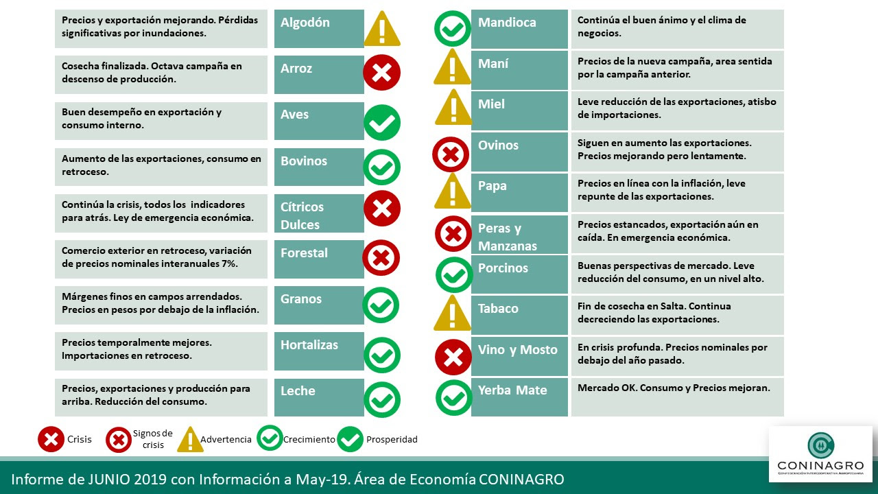 Los 6 rojos: Vino, Cítricos Dulces, Peras y Manzanas, Forestación y Arroz. Su estado actual se explica mayormente por tener costos más altos que los precios, destinar gran parte de su producción al mercado interno, teniendo su consumo estancado y exportaciones que no repuntan. El caso del arroz mantiene por tercer mes el rojo, las peras y manzanas ya acumulan 7 meses en esta categoría, mientras que la vitivinicultura mantiene su 16vo mes consecutivo en crisis, desde el inicio de este relevamiento.