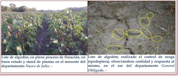 soleados). En cambio, en el resto de los cultivares, sembrados más tarde que continuaban en floración, de no registrarse precipitaciones en los próximos días, se verían afectados sus rendimientos finales. El estado del cultivo siguió siendo muy bueno en los lotes sembrados en fechas tempranas, con adecuado stand de plantas y buen control de malezas. En cuanto a los lotes sembrados más tarde, el stand de plantas que se observó no fue el adecuado, dado que las malezas avanzaron complicando el estado de los cultivos. Se realizaron las fumigaciones necesarias. En la semana se observaron ataques generalizados de orugas, (spodoptera), por lo que se efectuaron tratamientos de control. También continuó el monitoreo de las trampas para la detección de la presencia de picudos en los predios o cercanía de los mismos, realizándose aplicaciones, en caso de necesidad. En los lotes donde el cultivo comenzó la floración, las trampas no serían efectivas para la atracción de los picudos, que estarían atraídos por las mismas flores, monitoreándose posibles ataques en los pimpollos y evaluándose los daños. Se observaron los siguientes estados fenológicos: V “estados vegetativos” V1 (siembra a emergencia), V2 (emergencia), V3 (tercera hoja verdadera desplegada), V5 (quinta hoja verdadera despegada), V6 (sexta hoja verdadera despegada), V8 (octava hoja verdadera despegada), R “estados reproductivos” R1 (aparición del primer pimpollo) y en lotes más avanzados R2 (1º flor blanca-plena floración), comienzo de desarrollo de cápsulas.