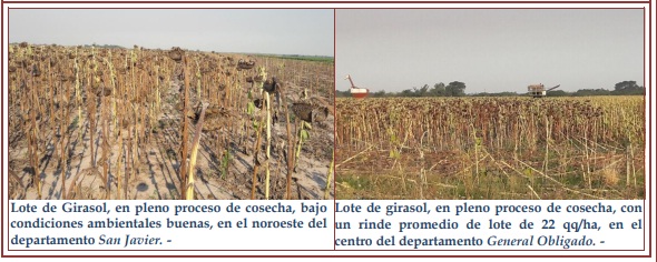 El proceso de cosecha continuó a ritmo sostenido con el paso de los días. En el departamento General Obligado con un grado de avance del 50 %, observádose también el movimiento de equipos y cosechadoras, en los departamentos San Justo, San Javier y Vera, sumando superficie cosechada. Los rendimientos promedios obtenidos se mantuvieron y fluctuaron entre mínimos de 14 qq/ha y máximos de 28 qq/ha, con lotes puntuales de 30 qq/ha, considerados buenos por el sector productivo. Los cultivares se detectaron en muy buen estado sanitario, no presentándose inconvenientes de patógenos ni de insectos, pero continuaron los ataques de palomas y cotorras, ya enunciados, en varios informes anteriores. Se observaron los siguientes estados fenológicos: R “estados reproductivos”, R5 – 5 (mitad de floración 50 %, el % dependiendo del área del capítulo cubierto por flores, cantidad de círculos), R6 (fin de floración, caídas de flores liguladas), R7 (la parte de atrás del capítulo comenzó a ponerse amarillento) y lotes más avanzados en R9 “madurez fisiológica” (parte de atrás del capítulo y las brácteas de color amarillento a marrón oscuro).