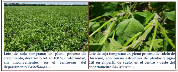 En un alto porcentaje los cultivares continuaron su crecimiento y desarrollo foliar con normalidad, buena estructura de plantas, cerrando surcos sin problemas. También comenzaron el período de floración, observándose en general, estado bueno a muy bueno. La situación sanitaria manifestada fue buena a muy buena. Se observaron, los siguientes estados fenológicos: V “estados vegetativos”, VE (emergencia), Vc (estado de cotiledón, hojas unifoliadas pegadas), V1 (1º nudo), V2 (2º nudo), V3 (3º nudo), V4 (4º nudo), V5 (5º nudo), V6 (6º nudo), V7 (7º nudo), V8 (8º nudo), V9 (9º nudo), R “estados reproductivos”, R1 (inicio de floración) y lotes más avanzados en R2 (floración con uno de los nudos superiores con hojas desarrolladas).