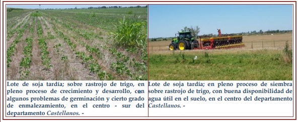 El proceso de siembra presentó un grado de avance del 95 %, aproximadamente unas 522.500 ha de las 550.000 ha previstas inicialmente, con un retraso de 5 puntos, en comparación con similar período, de la campaña pasada. En el área constituída por los departamentos del sur y centro santafesino, finalizó la siembra, solo en los departamentos del norte restaría la incorporación de algunos lotes, quedando supeditada la incorporación de nuevas superficies a las futuras precipitaciones de los próximos días, las cuales brindarían mejores condiciones de disponibilidad de agua útil en la cama de siembra. Continuaron las aplicaciones de herbicidas pre-emergentes, para un buen control de malezas. Se observaron, los siguientes estados fenológicos: V “estados vegetativos”, VE (emergencia), Vc (estado de cotiledón, hojas unifoliadas pegadas), V1 (1º nudo), V2 (2º nudo), V3 (3º nudo), V4 (4º nudo), V5 (5º nudo) y en lotes más avanzados, puntuales en V6 (6º nudo).