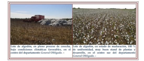 En la semana se continuó normalmente con las actividades, principalmente la aplicación de herbicidas, reguladores de crecimiento y defoliantes. Favorecido por las condiciones ambientales de la semana, el proceso de cosecha continuó en forma normal y sin complicaciones. Los rendimientos registrados en la zona Este algodonera siguieron siendo considerados por el sector como muy buenos, manteniéndose los rendimientos promedios mínimos de 24 – 25 qq/ha y promedios máximos de 32 – 33 qq/ha, hasta la fecha. En los lotes que finalizaron la floración y principalmente, en los defoliados y cosechados, sería conveniente la reactivación de las trampas para la captura de la mayor cantidad de picudos, disminuyendo así la población para la próxima campaña. También se recomienda la realización de aplicaciones de insecticidas en los predios en que se detectó la presencia del picudo algodonero, con la misma finalidad. Muy importante sería la destrucción de los rastrojos después de la cosecha, para que no haya rebrotes de las plantas evitando así la reproducción de picudo. En el área algodonera Oeste, continuaron evaluándose los cultivares en cada caso en particular y de acuerdo a ello se decidiría la actividad a desarrollar. En la semana próxima se comenzaría con el proceso de cosecha. Fueron muy complejas e irregulares las aplicaciones de control, en lo que concierne a herbicida, regulador de crecimiento y defoliante, encontrándose cultivares en situación o realidades muy diversas, como por ejemplo alturas de plantas de más de 1,50 mts, enmalezados, con dispar e irregular stand de plantas, todos indicadores que redundarían en la producción final.