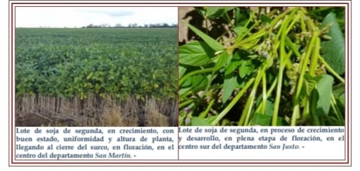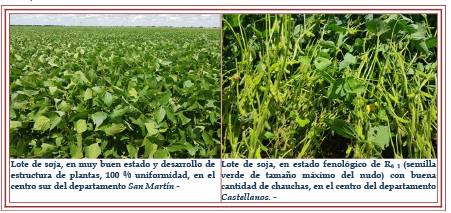 El cultivo se encontró en un 65 % estado bueno, con sectores o áreas muy buenas y lotes puntuales a excelentes, un 22 % en estado regular y el resto un 13 % en estado regular a malo, con impactos y consecuencias directas por los eventos climáticos sufridos. Se realizaron controles de malezas e insectos, hasta que la inestabilidad y las precipitaciones de bajas intensidades se presentaron. Fueron las actividades que se reiteraron semana tras semana, por el amplio cuadro de situación de estados fenológicos de los cultivares que se desarrollaron en la campaña. Se observaron los siguientes estados fenológicos: V “estados vegetativos”), V4 (4º nudo), V5 (5º nudo), V6 (6º nudo), V7 (7º nudo), R “estados reproductivos” R1 (inicio de floración), R2 (floración con uno de los nudos superiores con hojas desarrolladas), R3 (vaina de 5 mm de longitud en nudo) y lotes más avanzados en un bajo porcentaje R4 (vaina de 20 mm de longitud en nudo).