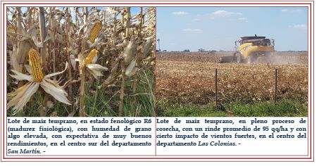 • En los departamentos San Martín y San Jerónimo, comenzaron a registrarse los primeros rindes y los mismos fluctuaron entre 100 – 105 – 115 qq/ha, con un máximo de 135 qq/ha.