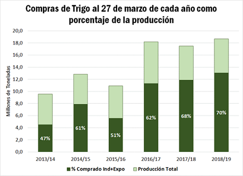 En cuanto al trigo 2018/19, en esta campaña los sectores industriales y exportador ya han efectuado compras por un total de 13,1 millones de toneladas, lo que equivale al 70% de la última cosecha. Este porcentaje de compras en relación a la producción es el más alto de las últimas seis campañas comerciales, tal como muestra el gráfico a continuación. Además, en términos absolutos, este tonelaje de negocios es el más elevado en los registros, que datan del año 2000.