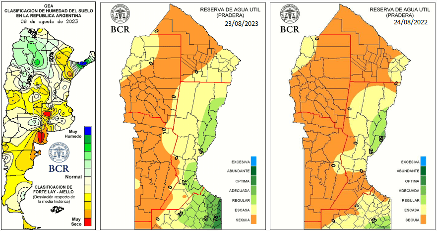 Sin embargo, las precipitaciones estuvieron ausentes en gran parte del centro y oeste del país. Agosto volvió a dejar fuera la posibilidad de que la franja oeste de la región pampeana se recomponga. Las reservas de agua, actualmente, se presentan muy similares a las del año pasado, con requerimientos de agua superiores a los 110 milímetros. También la extensión geográfica de la falta de agua del oeste es similar a lo que sucedía a finales de agosto del 2022. Esto se ve en la imagen actual de anomalía de la reservas de suelo a nivel país y en detalle en la comparación para la región centro con las imágenes de reserva de agua para el primer metro del suelo.