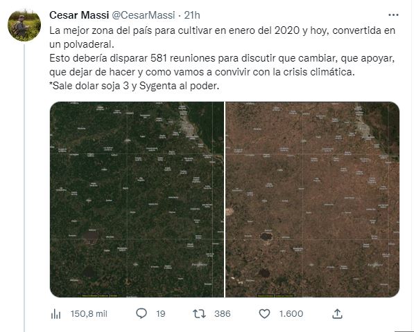 “¡Qué tristeza! Me dice el amigo @marcosmian1, que la laguna El Cristal, uno de los lugares más lindos de Santa Fe, finalmente se secó. Acá abajo voy a poner un par de imágenes satelitales que reflejan la sequía que vive el norte santafesino”, precisó.