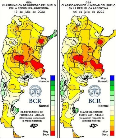 Se agravó la situación de los lotes implantados de trigo. El 12% del trigo es clasificado en condiciones regulares, el 60%, como bueno y un 28%, en muy buenas condiciones. Los días 12 y 13 de julio la región núcleo estuvo sumergida en temperaturas mínimas por debajo de 0°C. El sudeste cordobés marcó mínimas por debajo de 4°C. En Monte Buey los termómetros llegaron hasta -6,7°C. En Gral. Pinto, el monitor de la cabina del tractor marcaba -6°C. “Entre el frío y la escasa humedad, el trigo sobrevive, pero avanza muy lento”, señalan en Bigand. En Cañada Rosquín advierten que debería aparecer una lluvia pronto para mantener las expectativas de producción iniciales. Solo el 30% del trigo de la región está iniciando el macollaje. El año pasado, para esta misma época, el 60% del cultivo se encontraba transitando esa etapa. El 50% de los cuadros está emitiendo hojas y el 20% aun emergiendo.