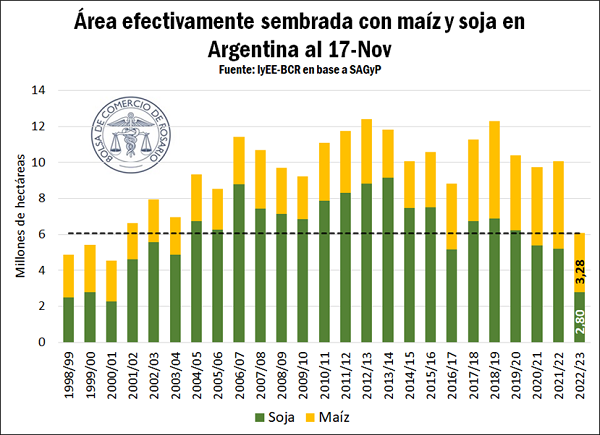En el caso del maíz, según datos oficiales, se ha completado la siembra de 3,3 millones de hectáreas, el 32% del área de intención y la superficie más baja para esta altura del año desde la campaña 2015/16. En tanto para la soja, los 2,8 millones de hectáreas implantadas a la fecha representan la superficie más baja para mediados de noviembre desde el año 2000/01.