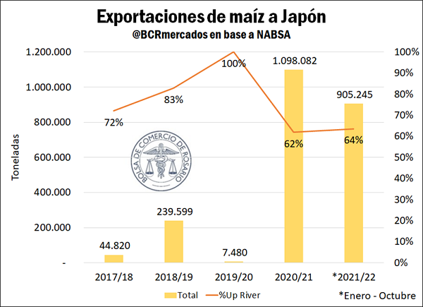 Consecuentemente, la suba de exportaciones argentinas a Japón se explica en la merma exportadora de maíz por parte de Estados Unidos, que pasó de embarcar maíz por casi 70 Mt en 2020/21 a 54 Mt proyectadas para la campaña 2022/23. En la campaña 2020/21 la potencia norteamericana fue responsable de más del 70% de las importaciones de maíz de Japón, con Brasil ocupando el segundo lugar, con un market share del 26%.