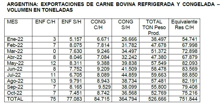 Las exportaciones de carne bovina del mes de octubre de 2022 resultaron equivalentes a 75,2 mil toneladas res con hueso; y el acumulado de los primeros diez meses del año trepa a 752 mil toneladas res con hueso. Los volúmenes exportados en octubre representaron un 29,5% de las cerca de 255 mil toneladas res con hueso producidas en el período. El acumulado de los últimos doce meses de actividad, desde noviembre de 2021 hasta octubre de 2022, muestran exportaciones totales de carne bovina refrigerada y congelada por un volumen de 617,4 mil toneladas peso producto, equivalentes a 880,8 mil toneladas res con hueso; y un valor monetario obtenido de 3.546 millones de dólares.