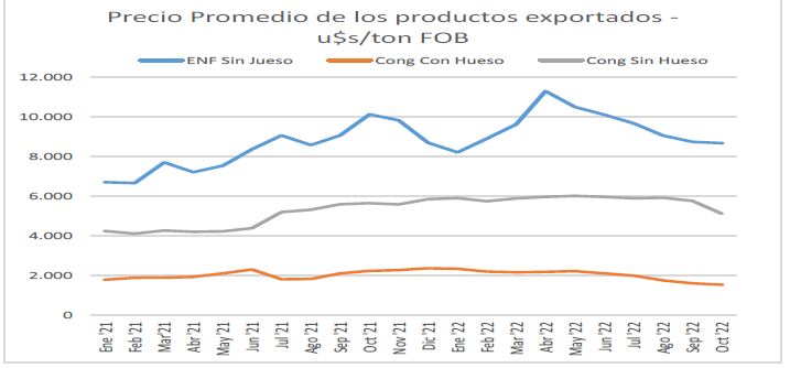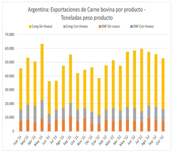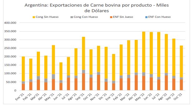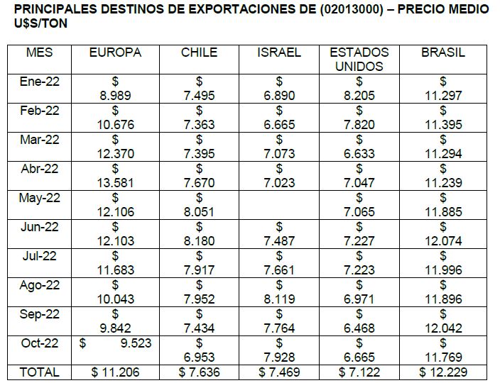 En octubre de 2022, se exportaron 36,6 mil toneladas de carne bovina congelada sin hueso, por un valor de 187,1 millones de dólares. El precio promedio de las exportaciones de carne bovina congelada sin hueso resultó cercano a los 5.117 dólares por tonelada.