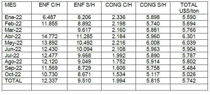 El precio promedio de exportación de carne bovina refrigerada y congelada resultó en el mes de octubre de 2022 de u$s 5.026 por tonelada. Este valor resulta un (-8,4%) inferior al obtenido en septiembre último; y un (-13,0%) más bajo que el precio medio de octubre de 2021, que había sido de u$s 5.776 por tonelada. En los últimos seis meses, se observa una persistente tendencia a la baja de los precios en los principales destinos desde el mes de mayo en adelante; y los u$s 5.026 dólares promedio por tonelada obtenidos en el mes de octubre se ubican u$s 1.300 por tonelada por debajo de los máximos registrados en el pasado mes de abril.