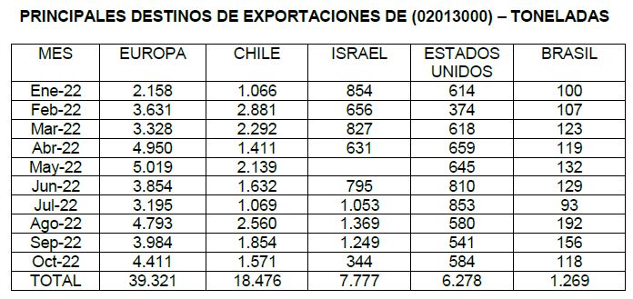 - Los volúmenes exportados en octubre representaron un 29,5% de las 255 mil toneladas res con hueso producidas en el período.