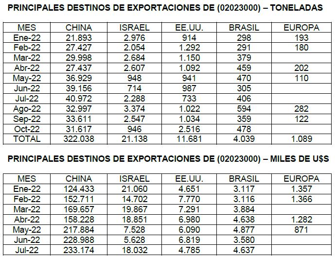 Los principales destinos de exportación para la carne congelada sin hueso en octubre de 2022 resultaron la República Popular China (31,6 mil toneladas / 157,3 millones de u$s), los Estados Unidos (2,5 mil toneladas / 11,9 millones de dólares), e Israel (0,9 mil toneladas / 8,4 millones de dólares).