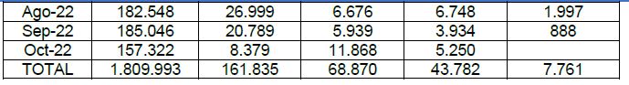 - Exportaciones: 52,8 mil ton peso producto (-5,8% respecto Octubre 2022) – 265,2 millones de dólares (-13,3%).