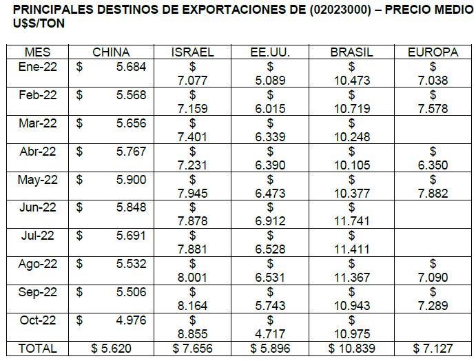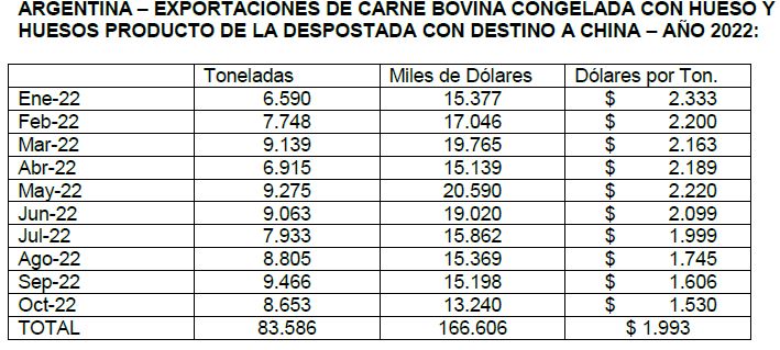 En octubre de 2022, se exportaron 8,7 mil toneladas de carne congelada con hueso y huesos producto de la despostada, casi exclusivamente con destino a la República Popular China. El valor obtenido por las ventas al exterior dentro de esta partida ascendió a 13,4 millones de dólares, por lo que el precio unitario resultó de poco más de u$s 1.500 por tonelada.