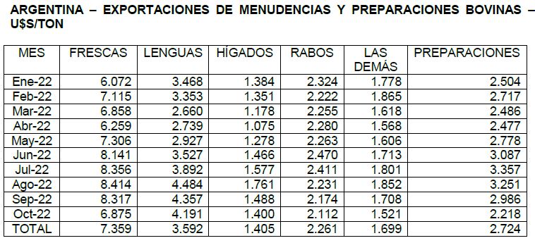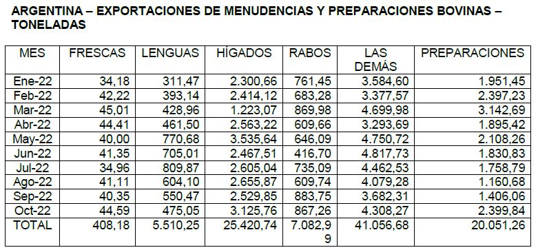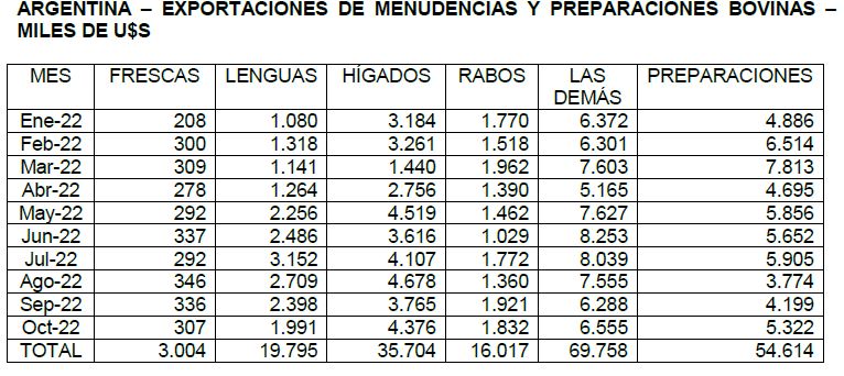 Las exportaciones de menudencias y preparaciones bovinas en octubre de 2022 resultaron de 11.221 toneladas por un valor cercano a los 20,4 millones de dólares. Las Menudencias Bovinas Frescas o Refrigeradas, con EE.UU. como principal destino, tuvieron embarques por (45 toneladas / 307 mil dólares / u$s 6.875 por ton.); las Lenguas Bovinas Congeladas, con Rusia como principal destino, (475 toneladas / 2,0 millones de dólares / u$s 4.191 por ton.); los Hígados Bovinos Congelados, con Rusia como principal destino, (3.126 toneladas / 4,4 millones de dólares / 1.400 u$s por ton.); los Rabos Bovinos Congelados, con Sudáfrica como principal destino, (867 toneladas / 1,8 millones de dólares / 2.112 u$s por ton.); los Demás Despojos de la especie bovina Congelados, con Rusia como principal destino (4.308 toneladas / 6,6 millones de dólares / u$s 1.521 por ton.); y las Preparaciones Bovinas, con Hong Kong como principal destino, (2.400 toneladas / 5,3 millones de dólares / u$s 2.218 por ton.).