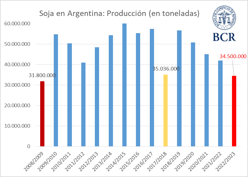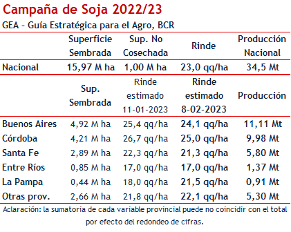 Con este nuevo guarismo se ha calculado el nuevo volumen estimado de soja (34,5 Mt), por lo que habrá un 18% menos de cosecha que hace un año atrás, cosecha también afectada por la falta de agua. El rinde nacional ha descendido pasando de 24 qq/ha en enero a 23 qq/ha en febrero.