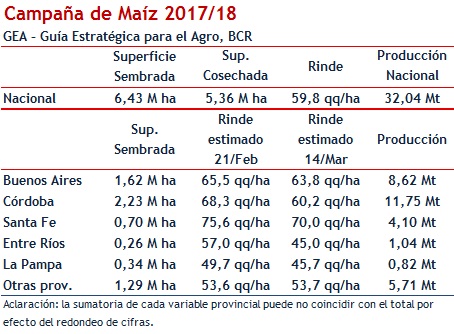 Con el 23% del maíz cosechado, los rindes que se observan están en línea con los valores estimados. Se nota un leve despegue, con mejores valores de productividad unitaria en las siembras tempranas. Pero tambien se prevén mayores problemas con las siembras tardías, sobre todo en Córdoba. De todas maneras, estas tendencias deberán confirmarse con el avance de las labores para hacer nuevos ajustes. Por lo tanto se mantiene la estimación de producción del cereal en 32 M de Tn, un rinde promedio nacional de 59,8 qq/ha. La superficie cosechada para grano comercial se estima en 5,36 M de Ha sobre un total implantado de 6,43 M de ha.