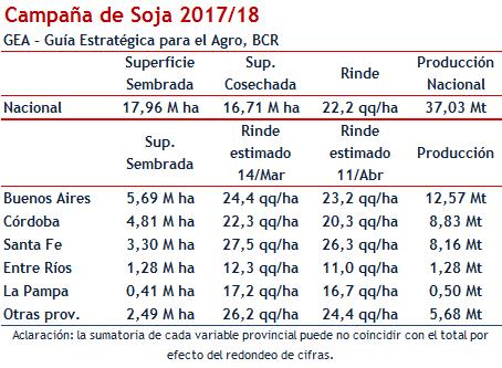 Así, la producción de soja es estimada en 37,03 millones de toneladas, teniendo en cuenta un rinde nacional promedio de 22,12 qq/ha, casi un quintal y medio menos que en el informe anterior. Con una superficie sembrada de 17,96 M de ha, y una superficie no cosechable que asciende a 1,25 M de ha.