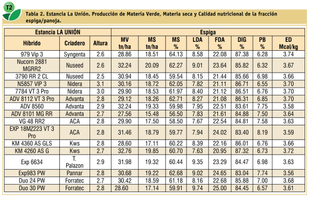 En la Tabla 1, se presentan los valores obtenidos de la fracción del tallo más la hoja de los híbridos de maíz evaluados en el Establecimientos La Unión. Los mismos corresponden a altura de plantas, producción de materia verde y materia seca, además de la calidad nutricional expresada por los valores de lignina y fibra (LDA, FDA y FDN), digestibilidad de la materia orgánica y proteína bruta, calculando, además, la energía de cada material (ED).