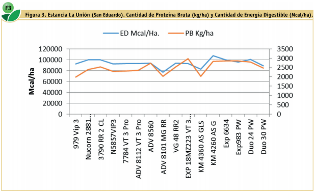 En la Figura 3, se muestran los parámetros de energía digestible/ha combinados con la producción de proteína bruta/ha, siendo estos parámetros muy importantes para la toma de decisiones en la elección de materiales para los requerimientos nutritivos de cada rodeo en producción. La conversión de materia verde/ha a materia seca/ha, y ésta a energía digestible/ha, permite calcular las raciones necesarias a producir por ha, para cualquier rodeo en particular, combinándolo también con la producción de proteína bruta.