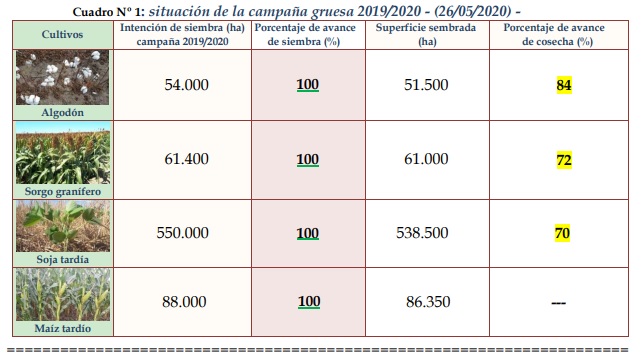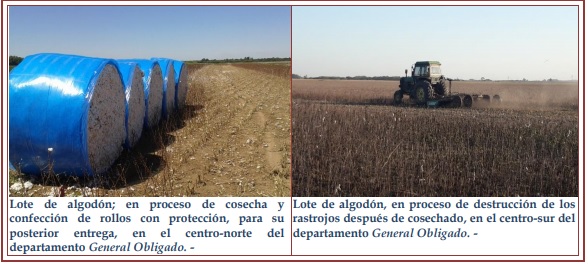 Zonas este-oeste: con las precipitaciones registradas, el proceso de cosecha de algodón se detuvo, frenando el ritmo constante alcanzado, quedando muy pocos lotes para su recolección en el sector este y una mayor cantidad en el oeste