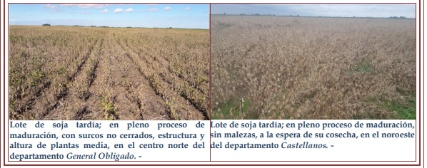 Se mantuvo lo siguiente, para el caso de las zona norte y centro, con los bajos rindes mencionados: 2 – 5 – 8 – 10 y hasta 15 qq/ha, la recolección se realizó 5 con equipos propios, de lo contrario, la misma no se efectuó, debido a los elevados costos. Se observó el siguiente estado fenológico: R “estados reproductivos”, en R8 (madurez plena).