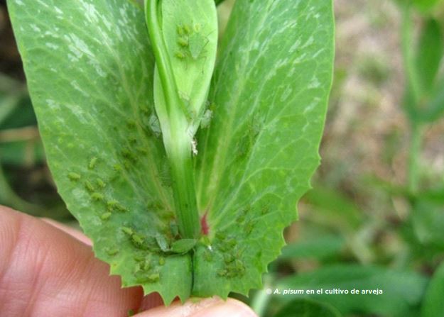 Se observa el incremento poblacional de las colonias de pulgón verde (A. pisum) reportadas en el informe anterior en lotes de leguminosas, principalmente arveja. En este cultivo las colonias se ubican en los pliegues de las hojas superiores, por lo que, al inicio de la infestación, pueden no ser detectadas. Una vez que las colonias proliferan, se distribuyen por toda la planta. En lotes de alfalfa también pueden detectarse incrementos en su abundancia por lo que se recomienda el monitoreo, haciendo hincapié en aquellas de menor desarrollo para evitar pérdidas de plantas en lotes con alta infestación.