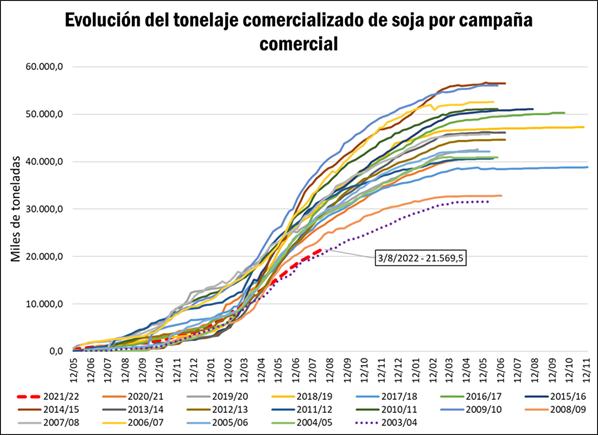 Desde el inicio de la actual campaña comercial de soja 2021/22, se comenzó a ralentizar la comercialización de la oleaginosa por parte de los productores. Realizando un análisis “en valores absolutos” de grano vendido, sin contemplar en el análisis las producciones relativas de cada campaña, al 3 de agosto industriales y exportadores pactaron la compra de 21,5 Mt de soja (datos oficiales del MAGyP).
