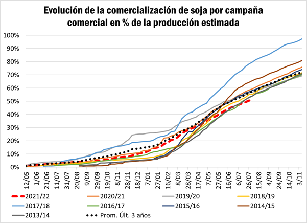 En relación con la producción de soja (estimación de GEA/BCR) se vendió el 51,1% de la cosecha, un atraso de 6,2 puntos porcentuales (o 2,62 Mt) respecto del promedio de las últimas tres campañas.