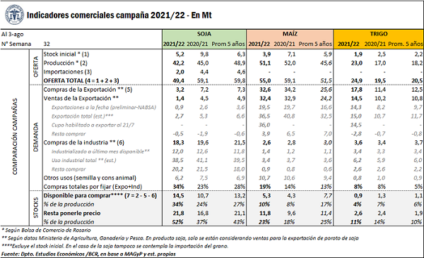 Situación comercial de los tres principales granos 2021/2022: Las ventas externas de los tres principales complejos (soja, maíz y trigo) es la segunda mayor de la década, 1,7 Mt por debajo de la pasada. El avance en las ventas de trigo compensa las complicaciones del complejo soja.