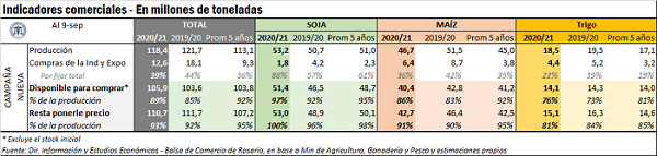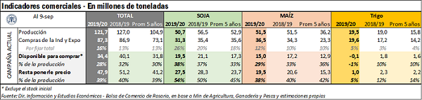 on la información disponible al 09 de septiembre para soja (poroto y subproductos), maíz y trigo, productos que conjuntamente representan cerca del 95% de total de las exportaciones agroindustriales argentinas, puede observarse que el total de grano adquirido por el sector exportador y la industria aceitera exportadora correspondiente a la actual campaña 2019/20 alcanza los 87,3 Mt, casi medio millón de toneladas por encima de la histórica campaña 2018/19 cuando Argentina batió el récord de producción, y 14 Mt arriba del promedio de los últimos 5 años.