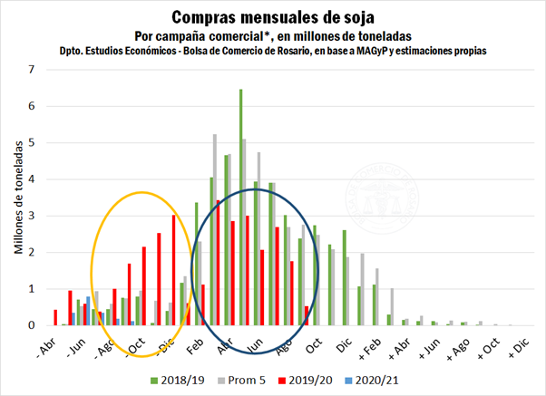 Como puede observarse en el gráfico que sigue, el volumen mensual de compras de soja que reporta el Ministerio de Agricultura, Ganadería y Pesca en el ciclo 2019/20 de hecho se mantuvo muy por encima de años anteriores entre los meses de agosto a diciembre de 2019 (tal como se muestra en el círculo amarillo) para, a partir de allí, sofrenarse y ubicarse por detrás de la media (círculo azul).