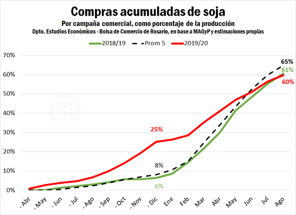 En soja, en tanto, el volumen actual de compras tanto del sector exportador como industrial (cuyos subproductos, harina y aceite, se destinan a su vez mayormente al mercado externo) alcanza los 31,3 Mt, por debajo de los 35,4 Mt anotados a la misma fecha del año anterior así como también del promedio del último lustro. La diferencia, sin embargo, es menos de lo que ha caído la producción ya que de una cosecha total de 56,5 Mt en el ciclo 2018/19 se pasa a 50,7 Mt en la actual campaña 2019/20, como consecuencia del clima caluroso y el déficit de agua de los meses de febrero y marzo.