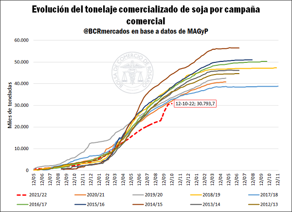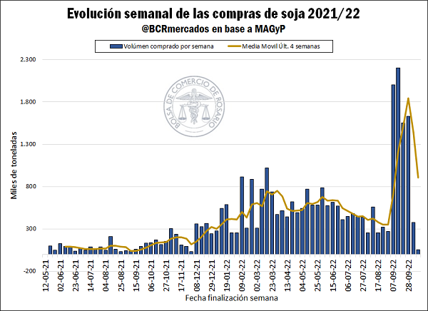 Soja 2021/2022. Situación Comercial: las compras de la industria y la exportación entre el 6/10 y el 12/10 de 2022 fueron de apenas 55 mil toneladas, 85% por debajo del volumen negociado la semana anterior