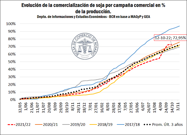 Soja 2021/2022. Situación Comercial: En relación con la producción de soja (estimación de GEA/BCR) se vendió el 72,9% de la cosecha, adelantándose con respecto a la 2020/21 (71%) y al promedio de las últimas 3 campañas (68,4%)