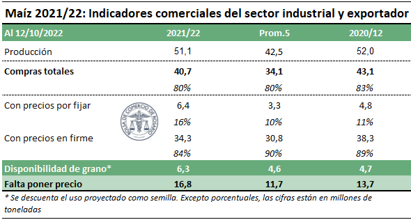 En plena siembra de la nueva campaña maicera, va quedando poco maíz por comercializar de la campaña 2021/22. Al 12 de octubre, se informó que ya se habían comercializado 40,6 millones de toneladas de maíz, un 80% de los 51 millones de toneladas que se estima se produjeron a nivel país en la campaña (GEA – BCR).
