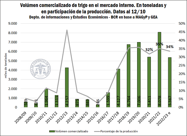 La campaña de trigo 2022/23, con comienzo formal en nuestro país el primero de diciembre, lleva comercializadas al 12 de octubre 5,36 millones de toneladas. Esto se ubica 2,7 millones de toneladas por detrás de los 8,1 millones de toneladas que se llevaban comercializadas en la 2021/22 a la misma fecha, y representa el menor volumen comercializado a esta altura de la campaña desde la 2017/18.