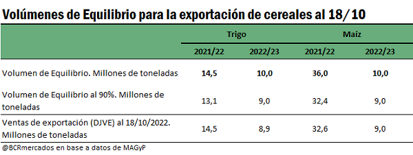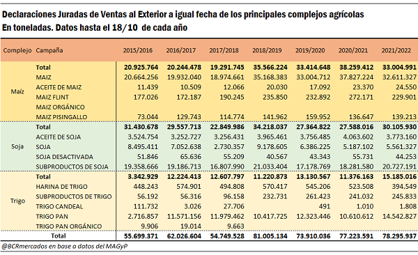 Si se observa el desenvolvimiento del sector exportador en los principales complejos para esta campaña 2021/22, al 18 de octubre se han anotado DJVE por 33 Mt del complejo maíz, con el maíz en grano superando el 90% del Volumen de Equilibrio fijado oficialmente por el MAGyP, con 32,6 millones de toneladas. En el caso del trigo hay declaraciones de ventas externas por 15,2 Mt para todo el complejo, dentro de las cuales el trigo en grano alcanza el Volumen de Equilibrio oficial establecido de 14,5 Mt.