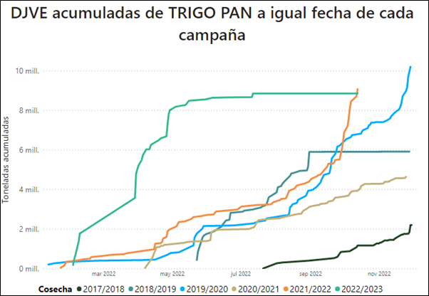 • Campaña de Trigo 2022/2023. Situación Comercial: se llevan comercializadas 5,36 millones de toneladas de trigo nuevo.