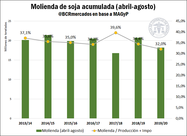 DATO N°1 – La molienda de soja cayó un 20% interanual en agosto. El acumulado en la campaña (mayo-agosto) ya se ubica un 12% por debajo de 2019