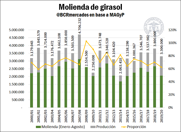 DATO N° 2 – La molienda de girasol se ubica en su menor nivel en 5 años en lo que va de 2020. La proporción de la producción industrializada hasta agosto es la menor desde la campaña 2001/2002